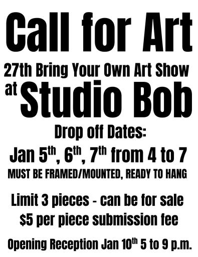 Studio Bob is seeking submissions for its 27th Bring Your Own Art show to be held in January. Artists can submit up to 3 pieces of any size, medium, or family friendly theme on January 5th, 6th, or 7th from 4 p.m. to 7 p.m. There is a $5 fee per item submitted. Pieces can be submitted by the artist, or on behalf of a friend or family member (as long as proper credit is given) and can be for sale or not; Studio Bob will take a 20% Commission on sales.