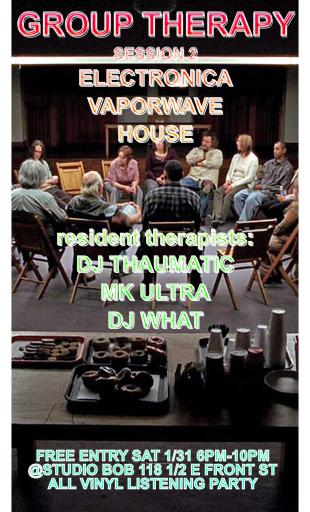 Join Resident Therapists DJ Thaumatic, DJ What, and MK Ultra for an evening of Vinyl Therapy, featuring electronica, vaporware, house, and whatever else they feel like playing. Guaranteed to make you want to dance. Entry is free, Donations are Welcome.