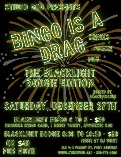 Come for the Bingo, stay for the Boogie Hostess Blake McCabe brings the sass to Blacklight Bingo from 6 to 8, featuring appetizer bar, drink specials and fabulous prizes. DJ What brings the Boogie from 8:30 to 10:30, featuring classic house hits from the 90's to today. $30 for Bingo (Includes 1 bingo card and a drink ticket - extra bingo cards can be purchased with a donation to Port Angeles Food Bank), $20 for Boogie, or $40 for both.