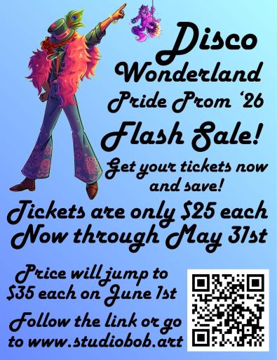 Get your tickets to 2026 Pride Prom - Disco Wonderland for only $25 each, now through May 31st. Price will jump to $35 each on June 1st. Don't miss out! Follow the ticket link for more details.